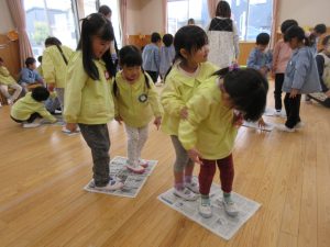 たいよう組さんと二人のペアを作り、一枚の新聞紙の上に乗ります。順番に先生とジャンケンをし、勝ったらそのまま、負けたら新聞紙を半分に折っていきます。最後まで新聞紙の上乗っていることができたペアの勝ちという、二人で協力するゲームです。手を繋いだり、ぎゅーっと抱き着いたり、色々な方法で新聞紙に乗っていました。