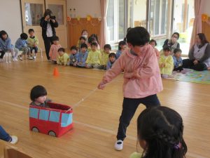 ゆめ・ひかり組(0・1歳児)は、手作りの乗り物に乗りたいよう組さんに引いてもらいました。