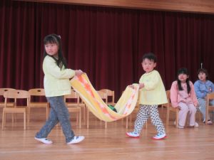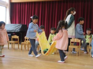 つき組(2歳児)は、タオルを使いボール運びゲームをしました。