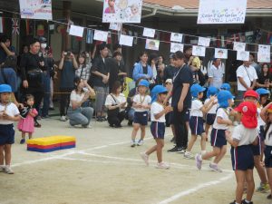 初めて体操服を着て、運動会に参加しました!お父さん、お母さんと離れて泣き出す子もいましたが