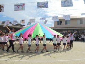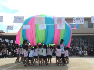 保育園最後の運動会。自分達で作ったタイダイ染めのTシャツを着て行ったパラバルーン。